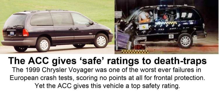 “The June 2006 to Sept 2007 version of the Chrysler Voyager scored just 3.15 out of 16 in the offset crash test. That’s an appalling result, yet the ACC effectively recommends this vehicle.”