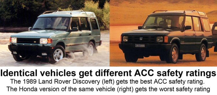 “The 1993-1998 Honda Crossroad is simply a Land Rover Discovery with Honda badges, yet it gets a different rating. The 1989 Land Rover Discovery gets the best ACC safety rating. The Honda version of the same Land Rover Discovery gets the worst safety rating. This is just appalling.”