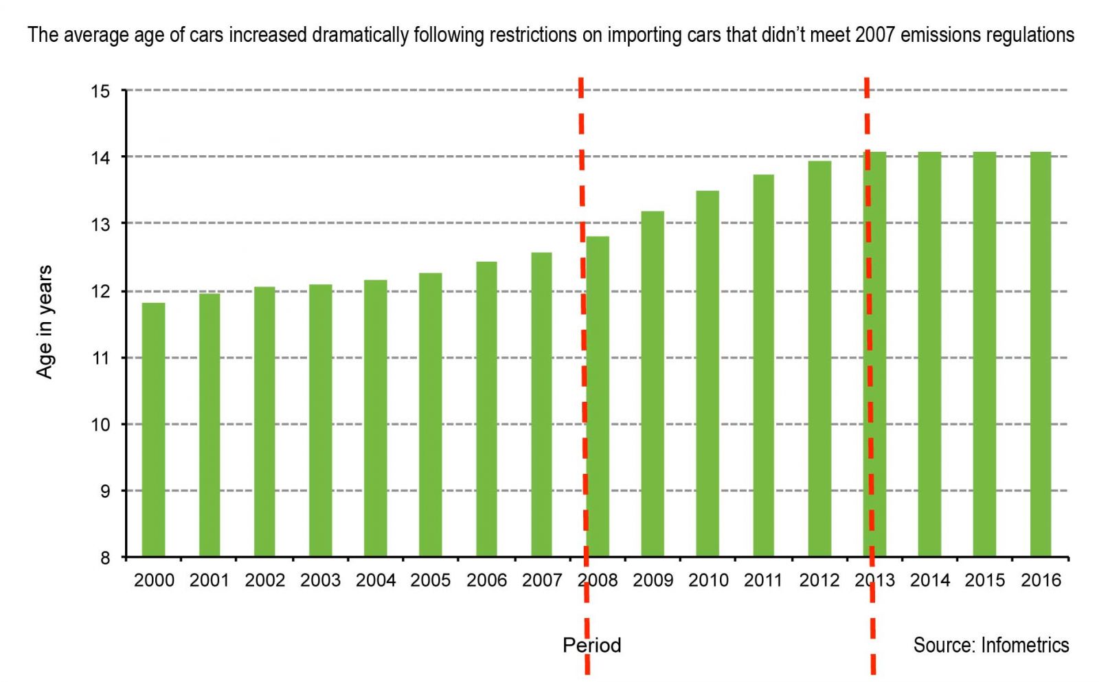 “With the best of intentions, the government banned vehicles that didn’t meet modern emissions standards. However, the end result was that the flow of cheap Japanese imports abruptly halted. This, in turn, meant that the prices of used cars jumped. This, in turn, meant that people kept driving their older, more polluting cars for far longer than they otherwise would have.”